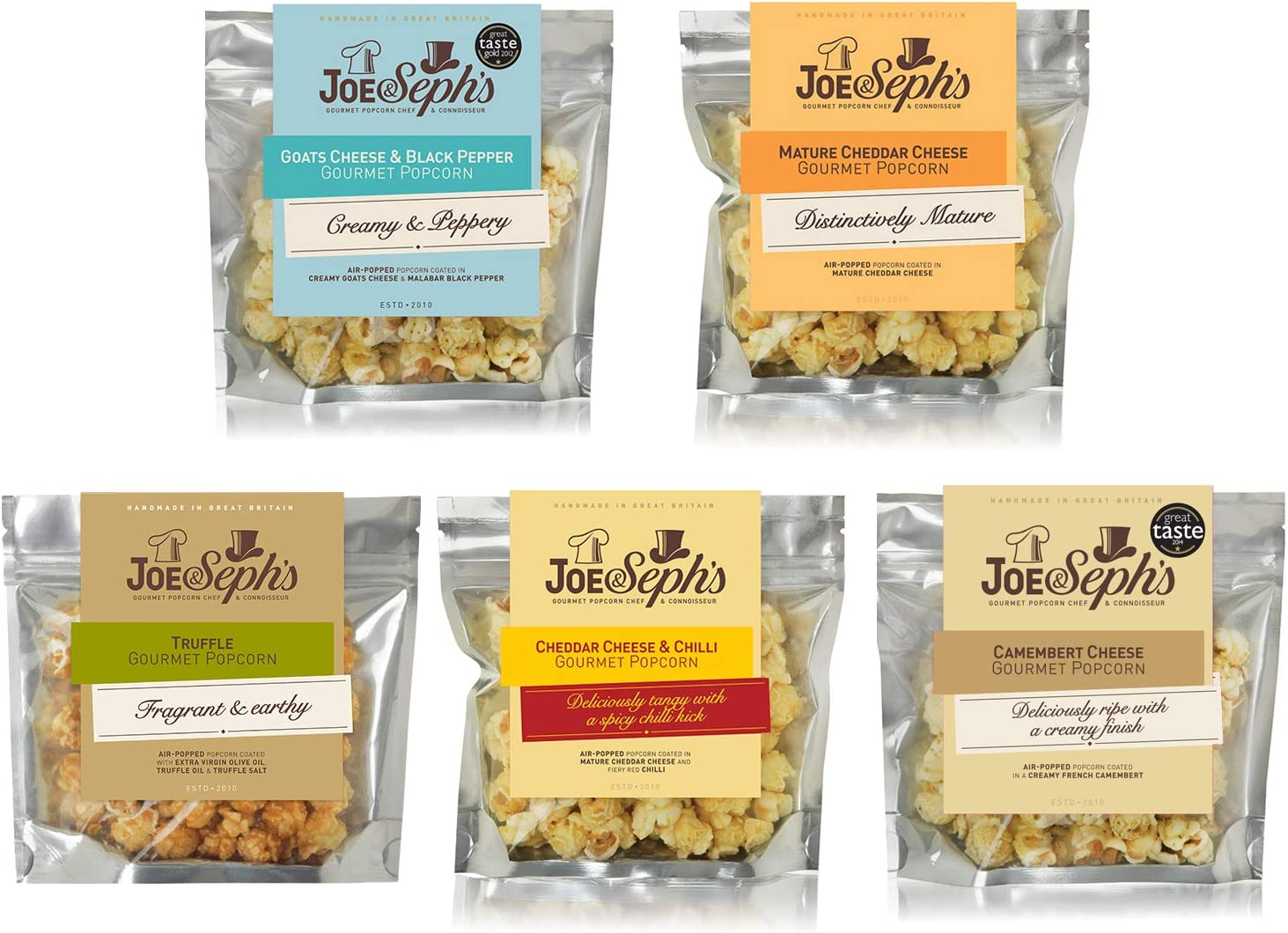 Goats Cheese & Black Pepper Corn, Sunflower Oil, Dried Goats Cheese (MILK) (23%), Malabar Black Pepper, Salt Mature Cheddar Cheese Corn, Sunflower Oil, Dried Cheddar Cheese (MILK) (25%) Camembert Cheese Corn, Sunflower Oil, Dried Camembert Cheese (MILK) (25%) Cheddar Cheese & Chilli Corn, Sunflower Oil, Dried Cheddar Cheese (MILK) (24%), Red Chilli Pepper Olive Oil, Truffle Oil & Truffle Salt Corn, Extra Virgin Olive Oil (31%), White Truffle Oil from Alba (7%) {Olive Oil, White Truffles, Natural Truffle Flavour}, White Truffle Salt