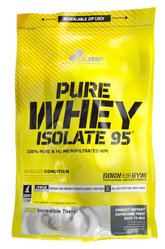OLIMP Pure Whey Isolate 95 is the highest quality, lactose-free, pure Whey Protein Isolate (WPI) supplemented with a complex of vitamins and minerals ensuring the normal course of metabolic processes during vigorous physical exercise and increased intake of proteins. Whey protein isolates are characterised by the highest nutritional value and anabolic activity of all dietary proteins. Obtained in the ion exchange process, non-denaturised, they retain the full structure and activity of functional whey proteins - beta-lactoglobulin, alpha-lactoalbumin, immunoglobulin, plasma albumin, lactoferrin, lactotransferrin, ceruloplasmine, phosphoglycoproteins, proteases and peptones. Owing to their high nutritional value and anabolic activity, isolated whey proteins are considered the most valuable sources of dietary proteins for high-performance athletes and physically active people. Whey protein isolates owe their high nutritional to the highest possible assimilability determined by their ideal solubility and favourable osmotic pressure of non-denaturised proteins as well as optimal proportions of exo- and endogenous amino acids with and an exceptionally high share of Branched Chain Amino Acids (BCAA) and Glutamine. The high anabolic activity, apart from the high nutritional value, results from metabolic parameters of whole whey proteins as well as of peptides and micropeptides formed as a result of their transformations. These substances act similarly as anabolic peptide growth factors. They facilitate transport of amino acids into muscle cells and stimulate anabolism. They form an antioxidant barrier. They stabilise lysosomes and inhibit the activity of catabolic lysosomal enzymes. They reinforce the cardiovascular, nervous, and immune systems.