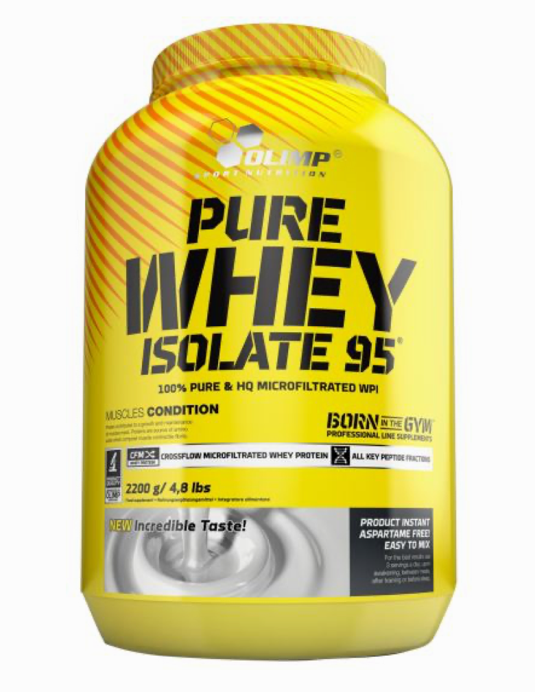 OLIMP Pure Whey Isolate 95 is the highest quality, lactose-free, pure Whey Protein Isolate (WPI) supplemented with a complex of vitamins and minerals ensuring the normal course of metabolic processes during vigorous physical exercise and increased intake of proteins. Whey protein isolates are characterised by the highest nutritional value and anabolic activity of all dietary proteins. Obtained in the ion exchange process, non-denaturised, they retain the full structure and activity of functional whey proteins - beta-lactoglobulin, alpha-lactoalbumin, immunoglobulin, plasma albumin, lactoferrin, lactotransferrin, ceruloplasmine, phosphoglycoproteins, proteases and peptones. Owing to their high nutritional value and anabolic activity, isolated whey proteins are considered the most valuable sources of dietary proteins for high-performance athletes and physically active people. Whey protein isolates owe their high nutritional to the highest possible assimilability determined by their ideal solubility and favourable osmotic pressure of non-denaturised proteins as well as optimal proportions of exo- and endogenous amino acids with and an exceptionally high share of Branched Chain Amino Acids (BCAA) and Glutamine. The high anabolic activity, apart from the high nutritional value, results from metabolic parameters of whole whey proteins as well as of peptides and micropeptides formed as a result of their transformations. These substances act similarly as anabolic peptide growth factors. They facilitate transport of amino acids into muscle cells and stimulate anabolism. They form an antioxidant barrier. They stabilise lysosomes and inhibit the activity of catabolic lysosomal enzymes. They reinforce the cardiovascular, nervous, and immune systems.